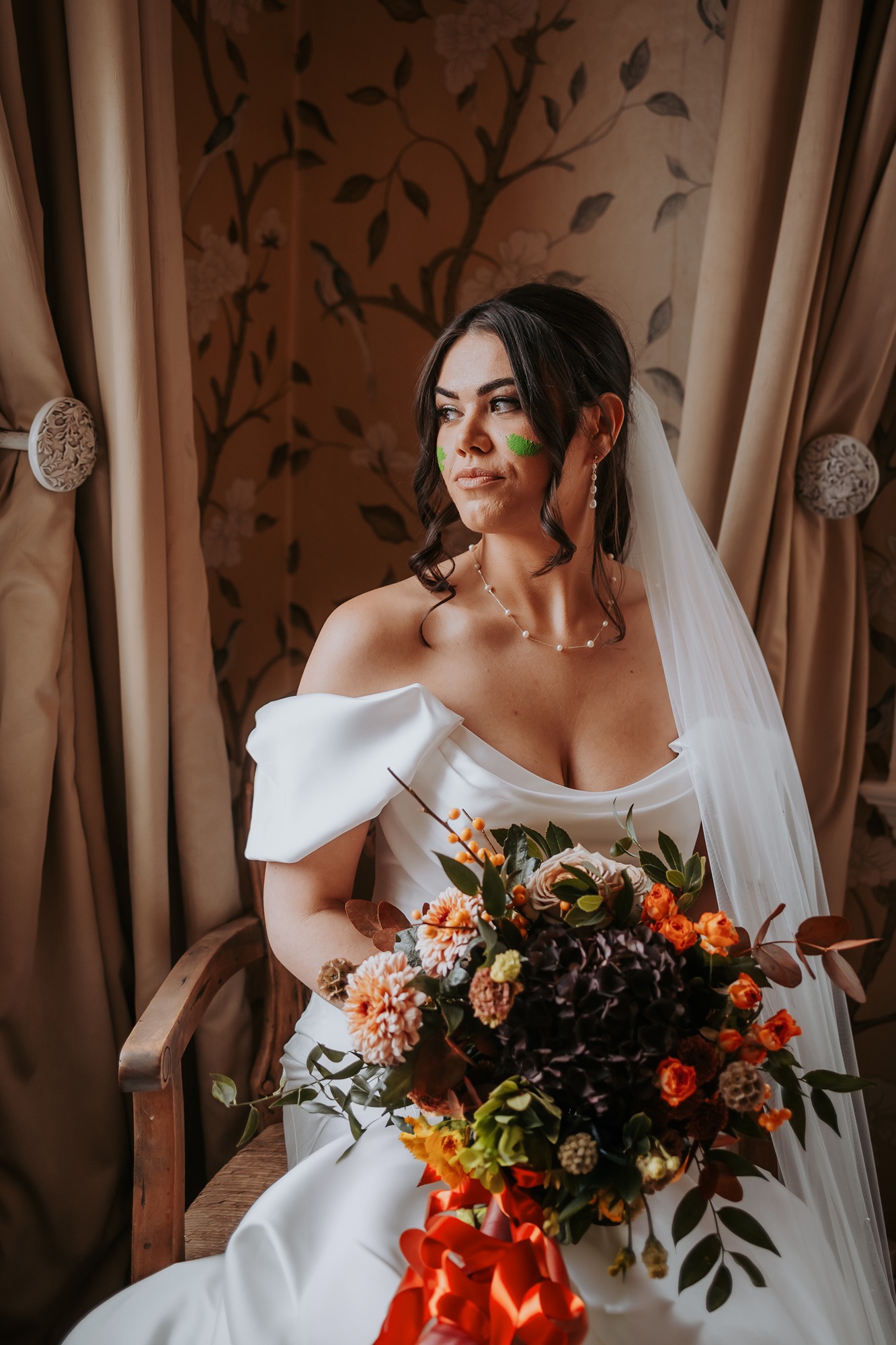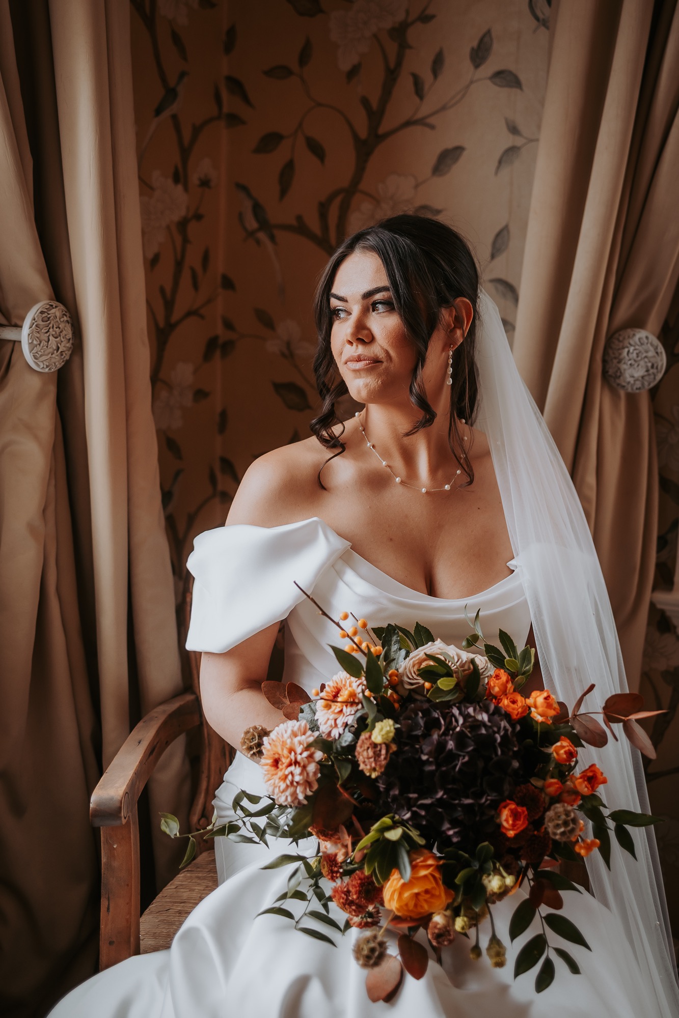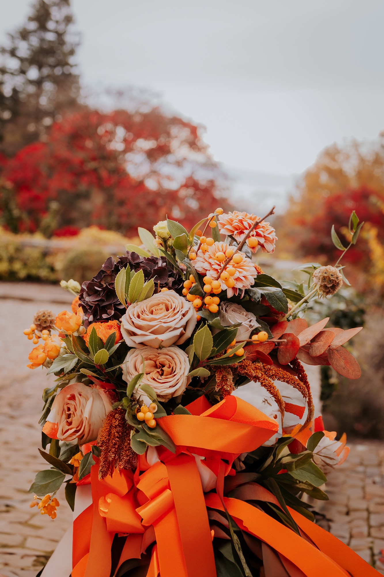Huge, textural, and unapologetically autumnal, it overflowed with seasonal florals and foliage in deep oranges, rich reds, and moody greens. And the extra-long, flowing ribbons? Pure drama! They moved with Rachel, caught the light, and added softness and scale to every moment.