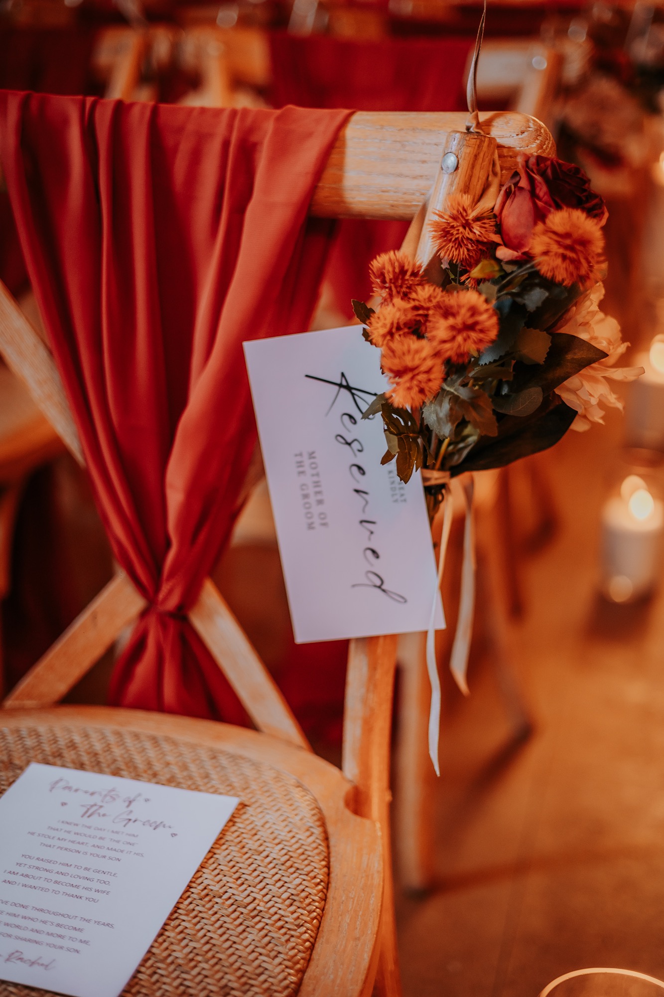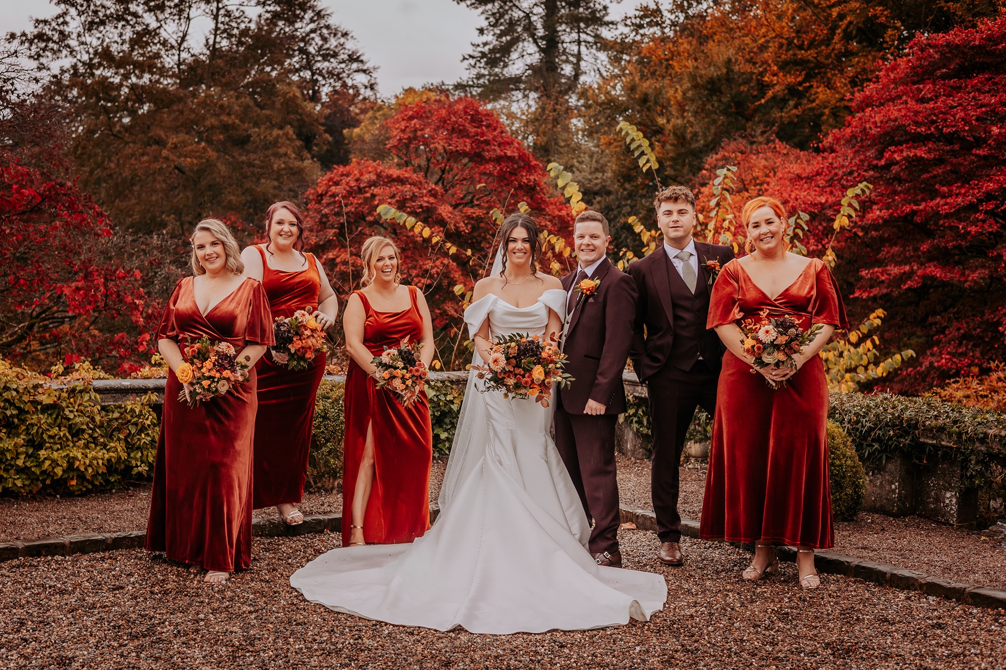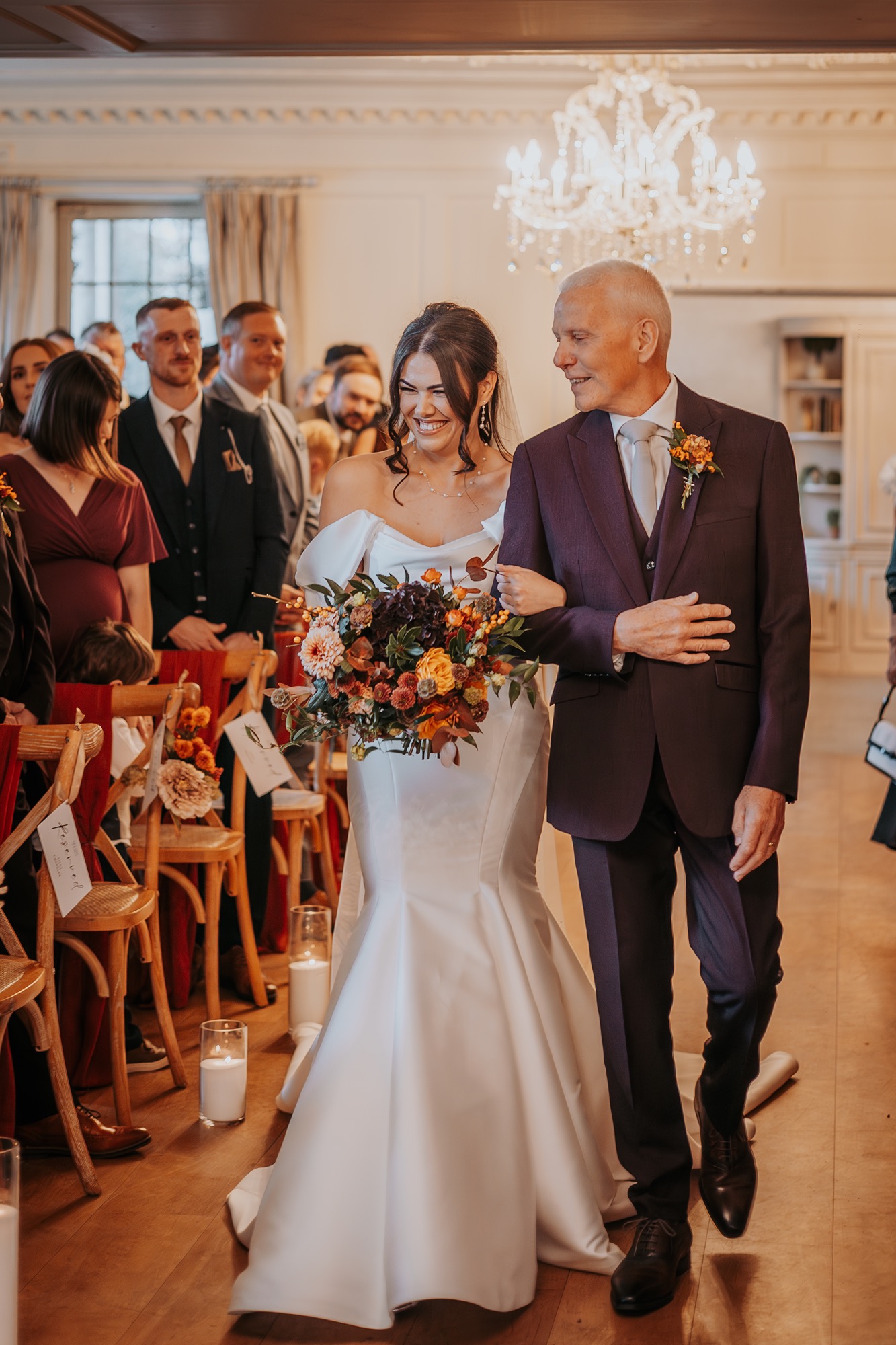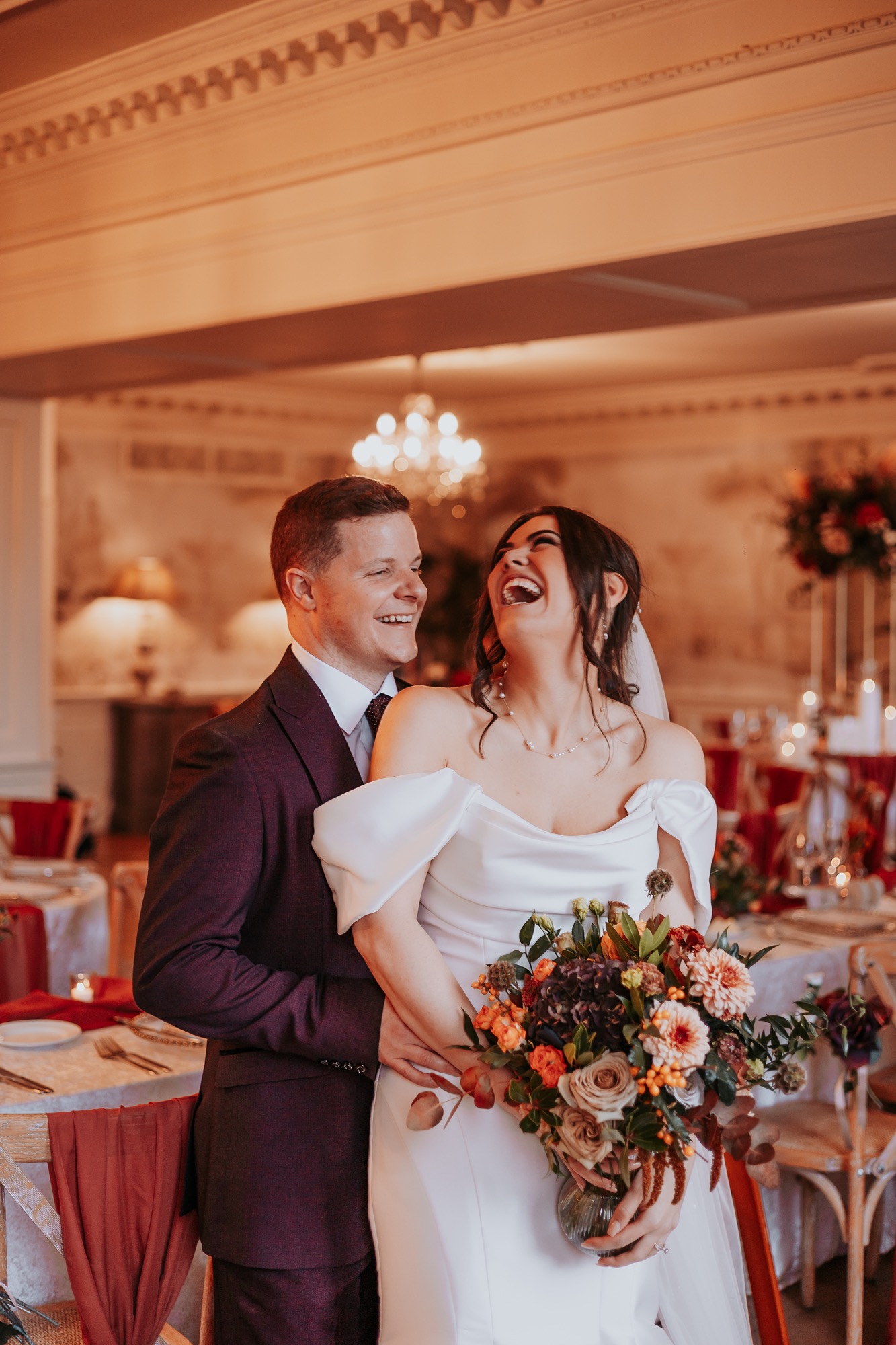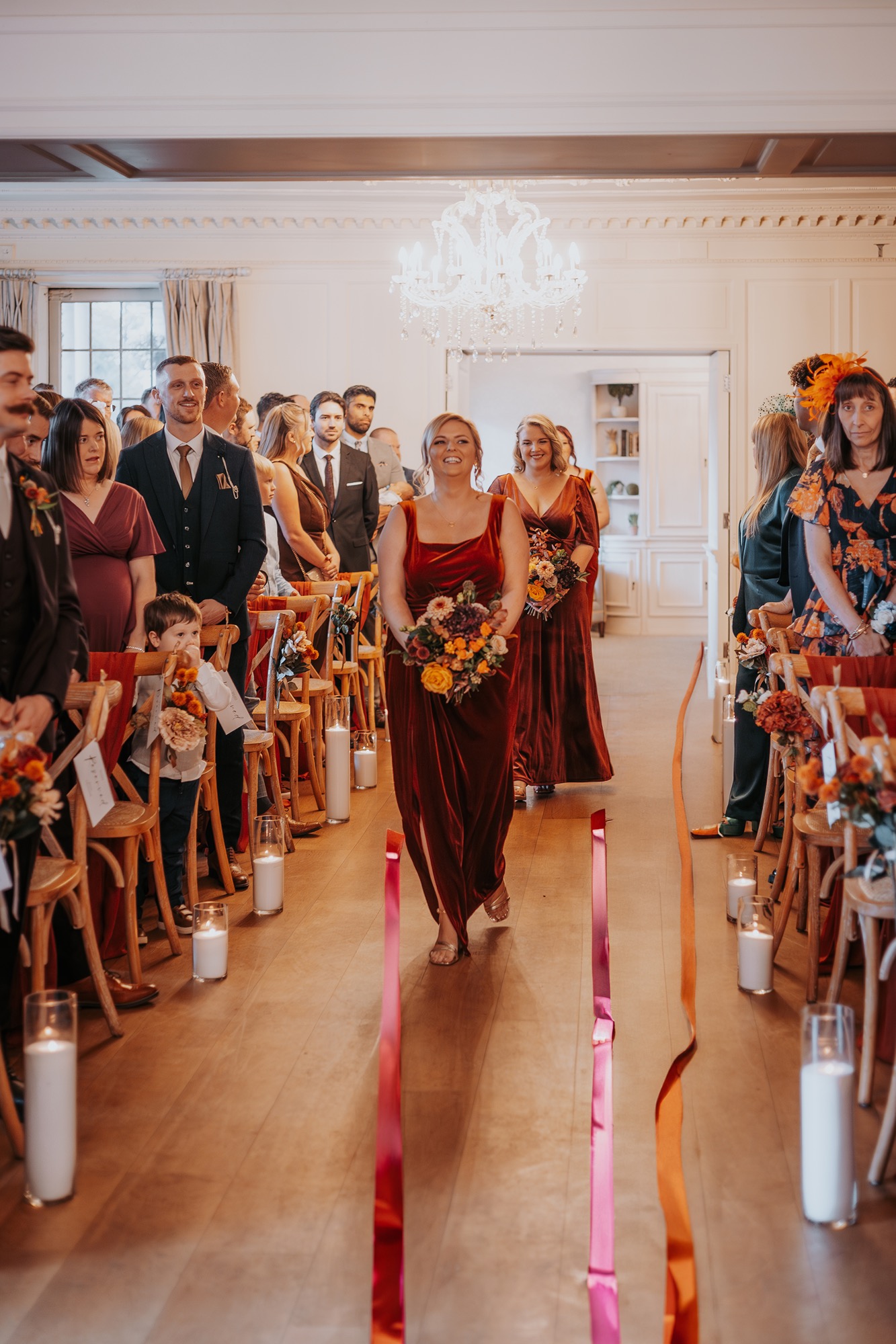 Think rich seasonal tones, warm fabrics, candlelight moods, and that unmistakable cosy feeling you only get from an autumn wedding in the UK. Deep rusts, wine reds, burnt orange florals, and soft neutrals wrapped everything in warmth — not just visually, but emotionally too.