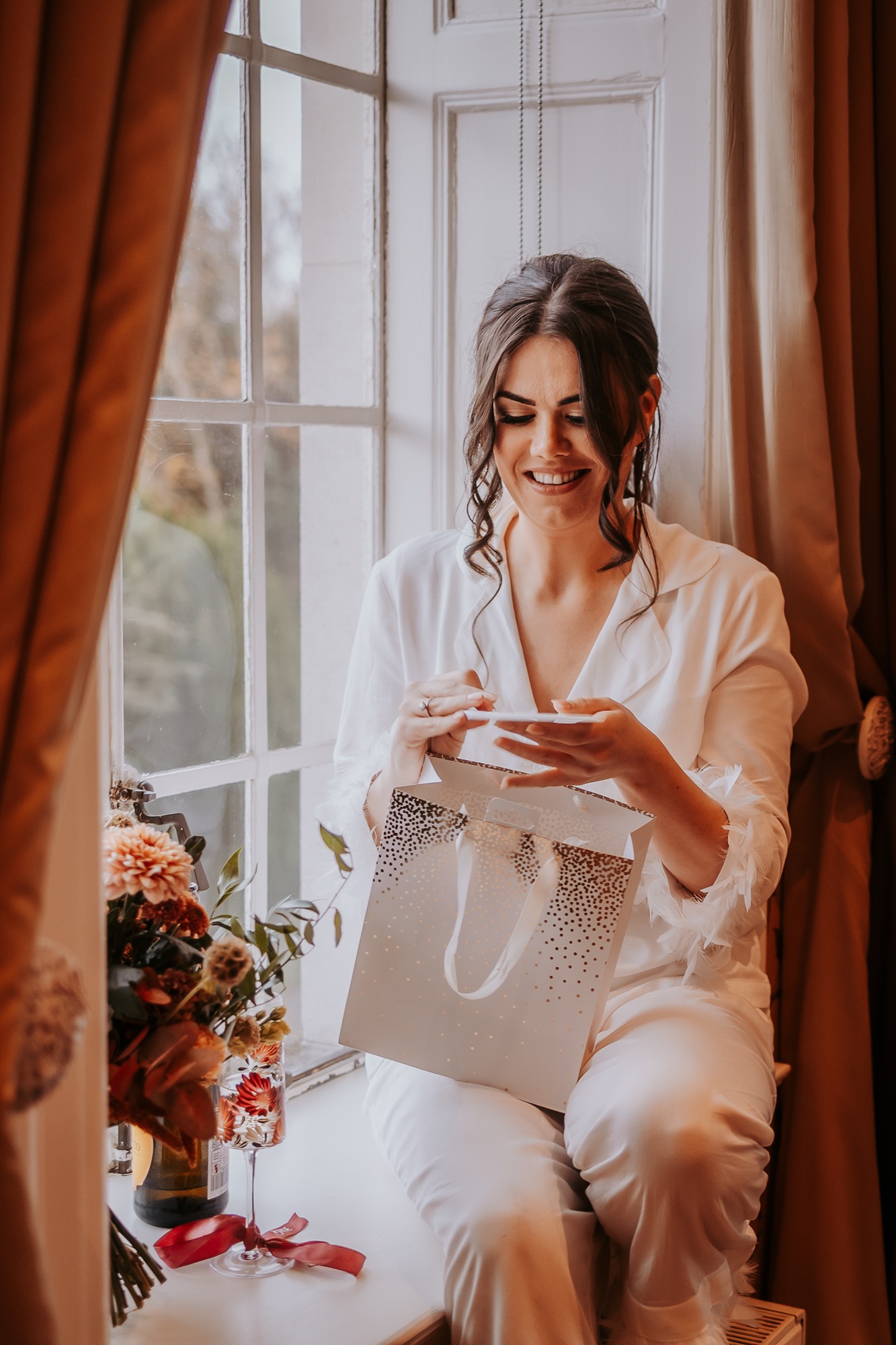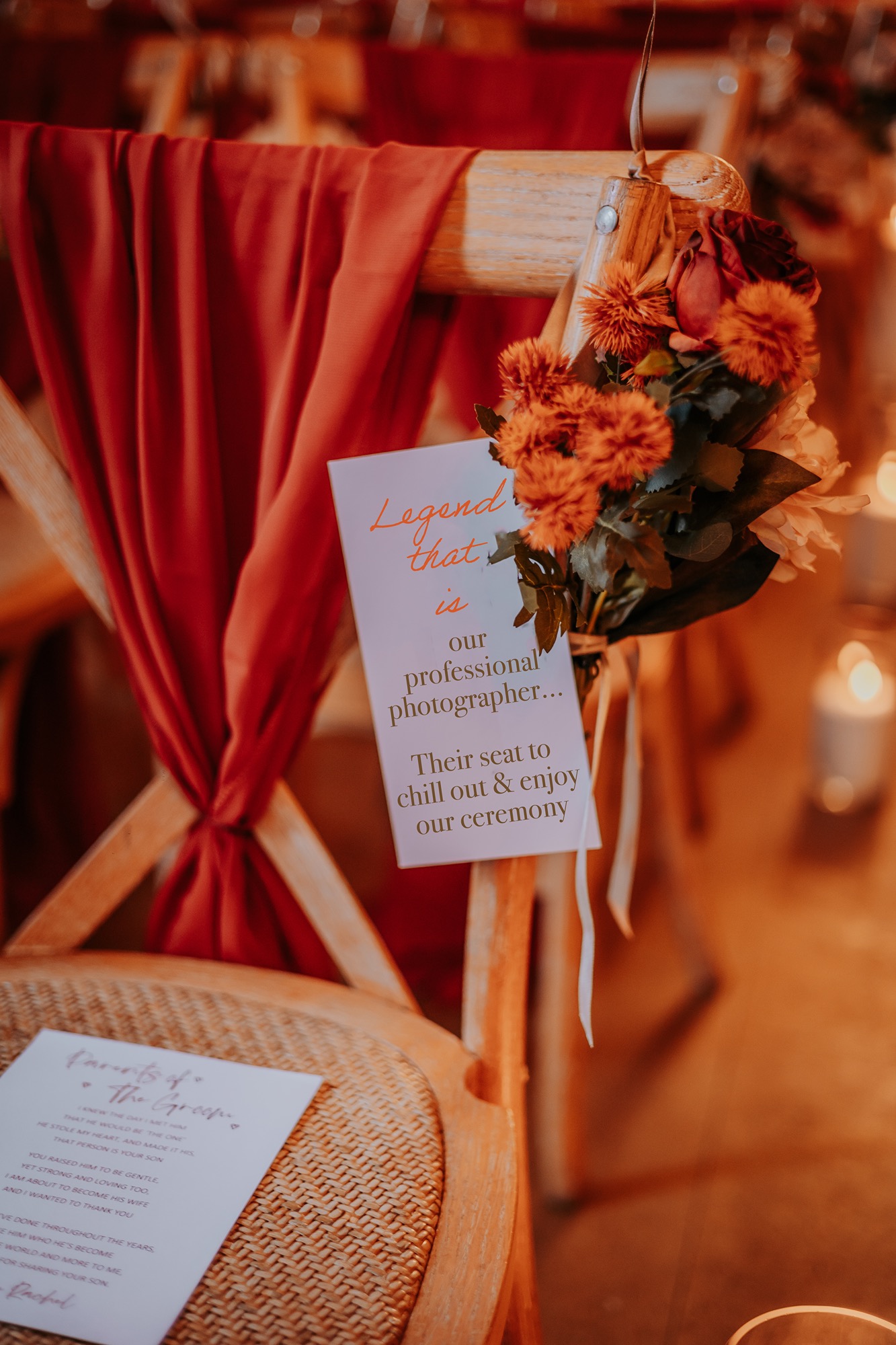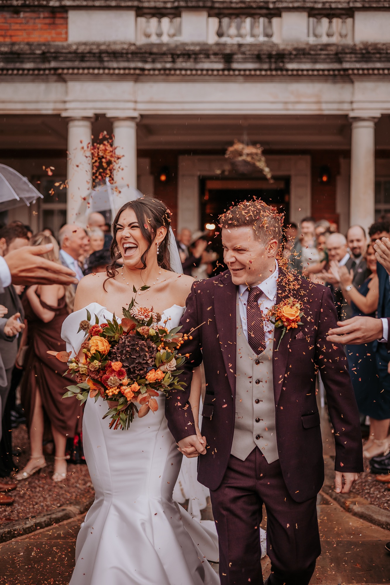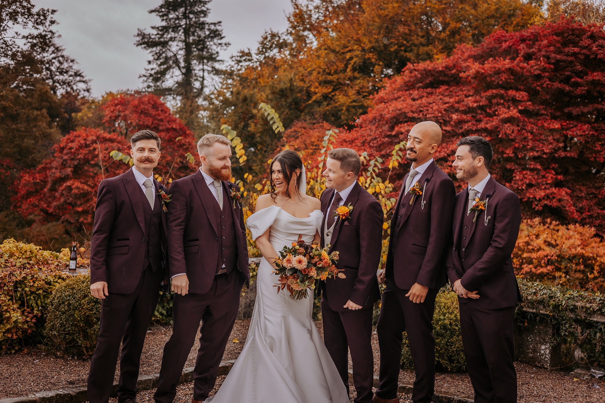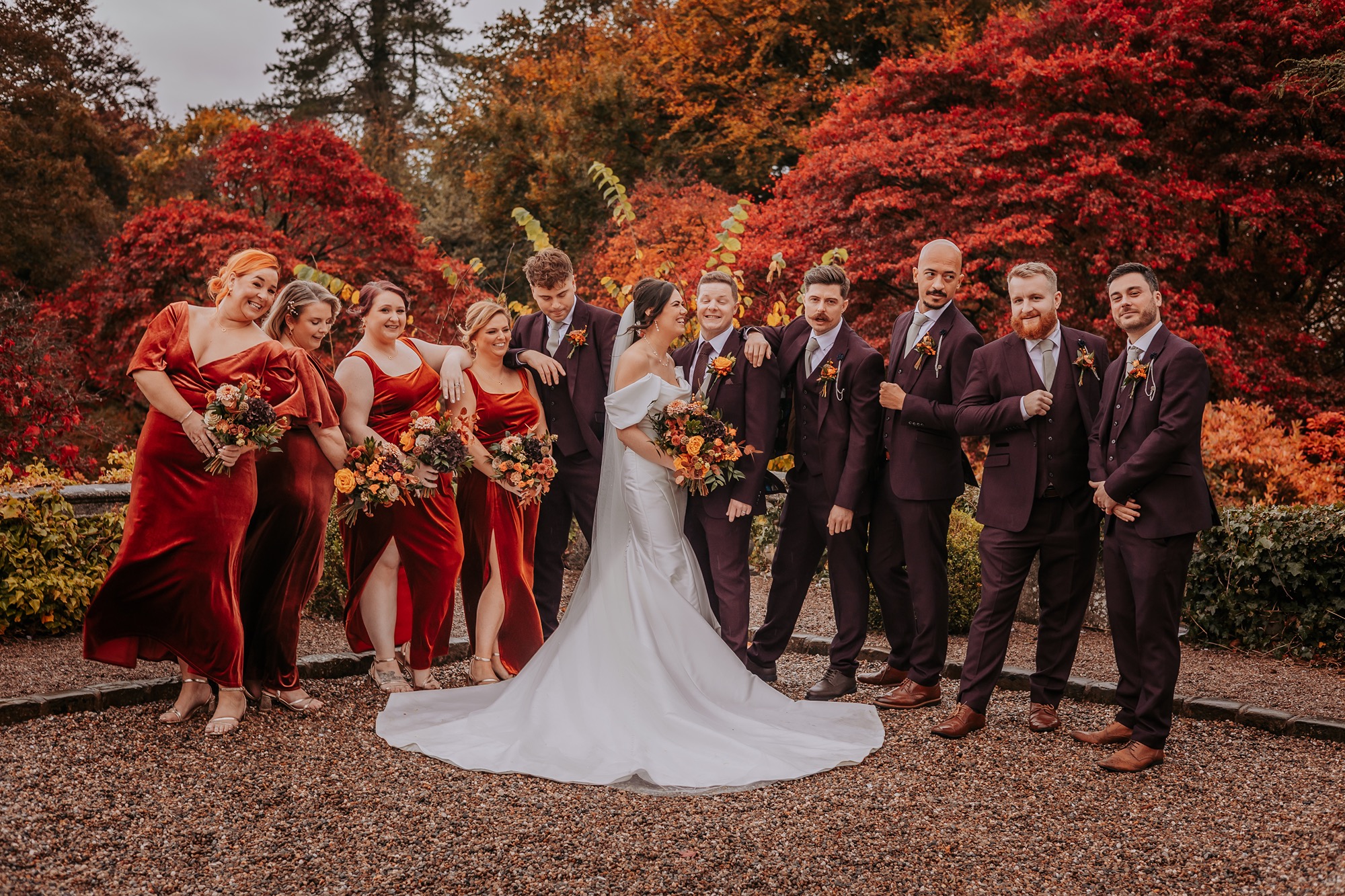 Think rich seasonal tones, warm fabrics, candlelight moods, and that unmistakable cosy feeling you only get from an autumn wedding in the UK. Deep rusts, wine reds, burnt orange florals, and soft neutrals wrapped everything in warmth — not just visually, but emotionally too.