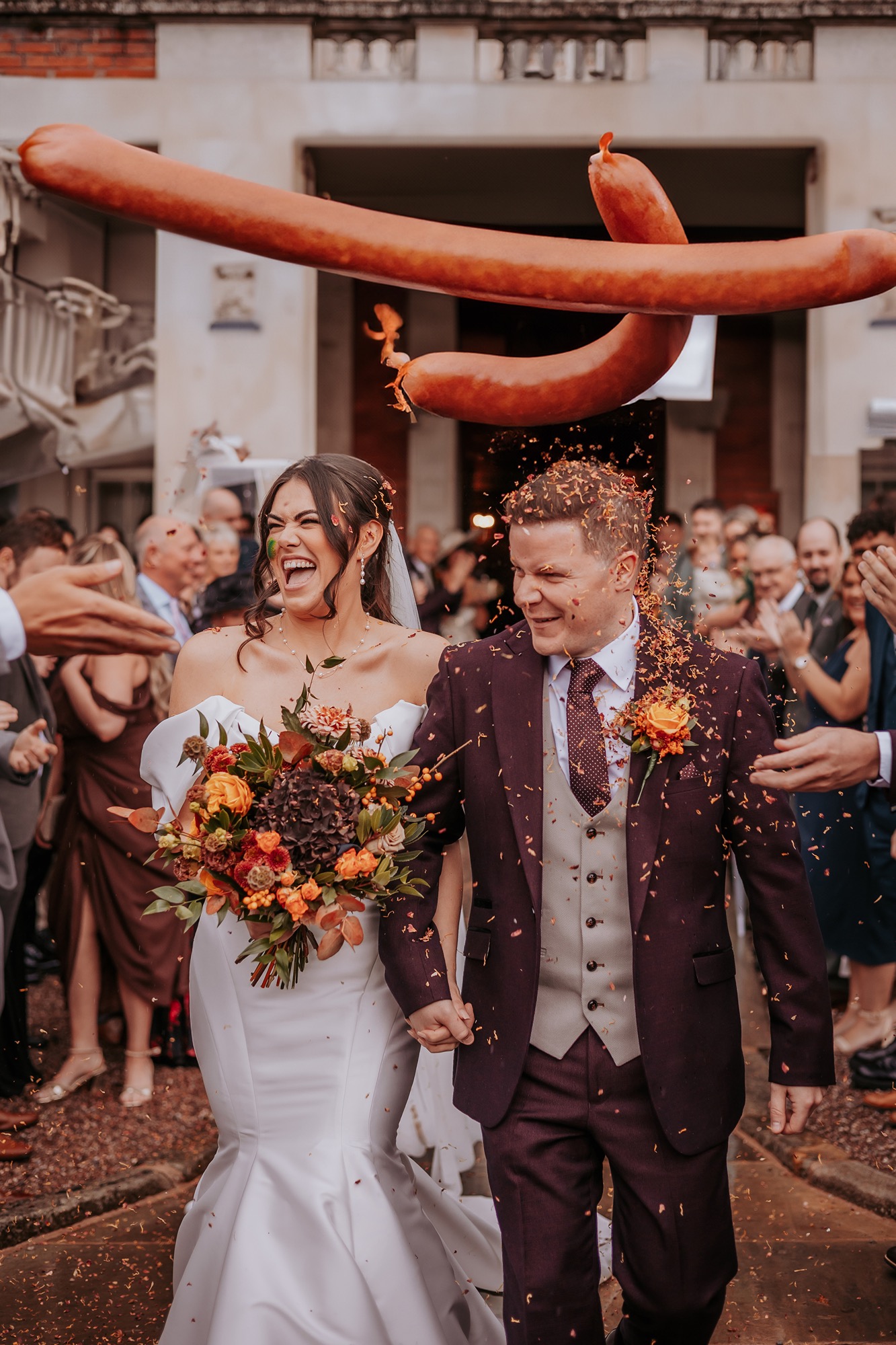As the newlyweds stepped out into cheers and confetti, laughter filled the air — followed by the unforgettable moment when a giant sausage was tossed mid-confetti.